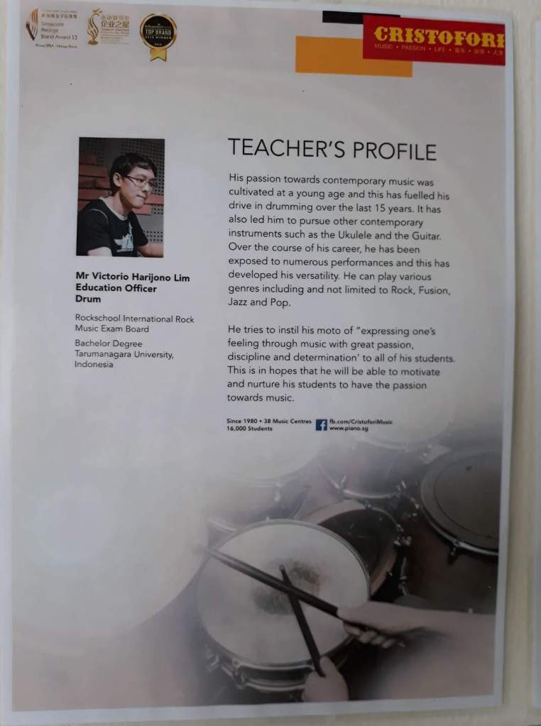 Victor picked up his first pair of drumstick at the age of 18, as when he followed his brother and friends for a jamming session. With his ability to imitate drum beat from songs, he then joined a couple of group bands and performed for school and campus event. Realizing that he was lacking of technique, music theory, and consistency in his drumming, he then took a proper lesson where he learned how to read drum notations, and basic drumming techniques.